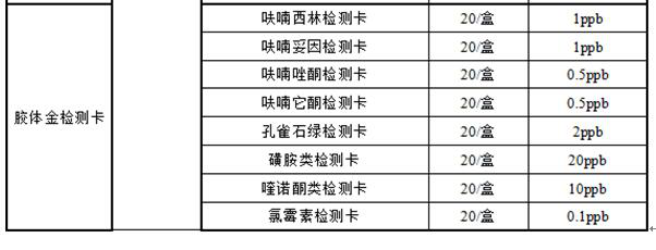 水產品的安全隱患主要是在養殖過程中藥物的過量使用及加工過程中添加劑的違規使用。食用水產品中對食品安全造成危害的藥物主要有:呋喃代謝物、四環素、環丙沙星等抗生素藥物殘留。公司針對市場上常見的水產品中藥物殘留開發對應的檢測試劑盒及膠體金檢測卡如下表: